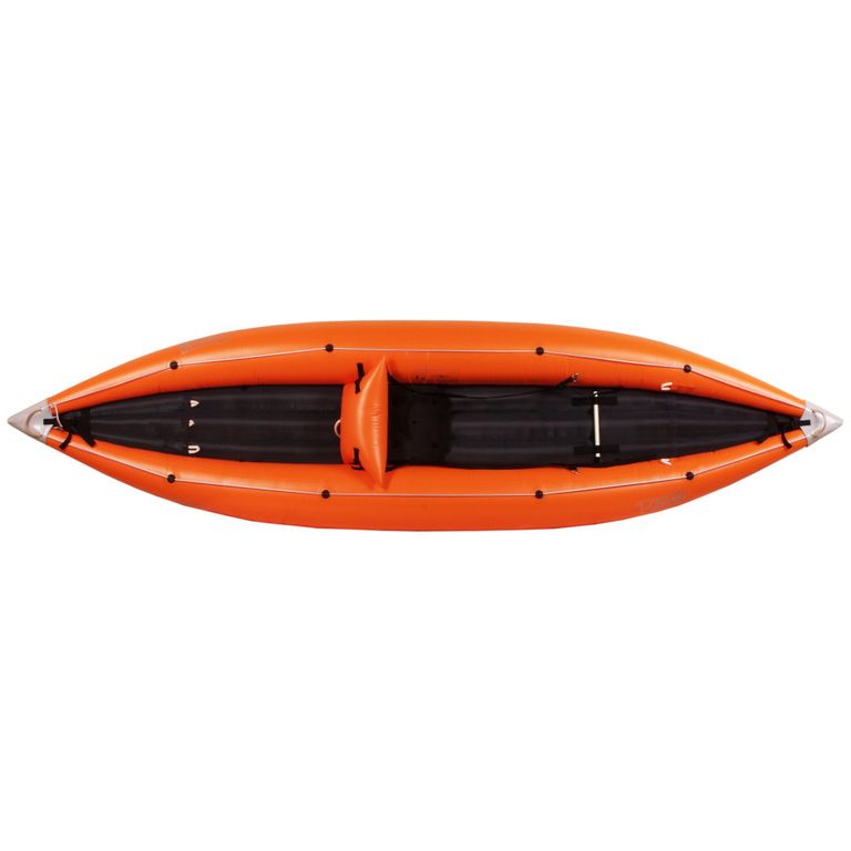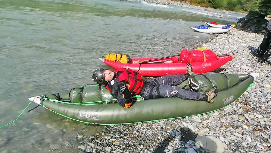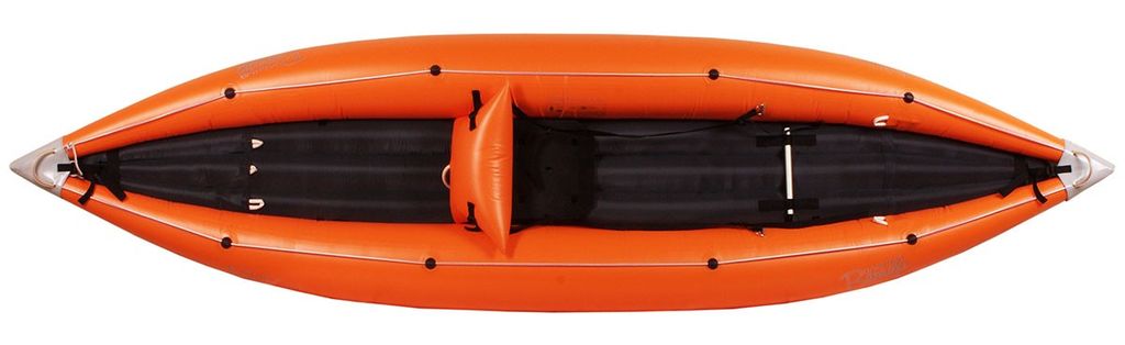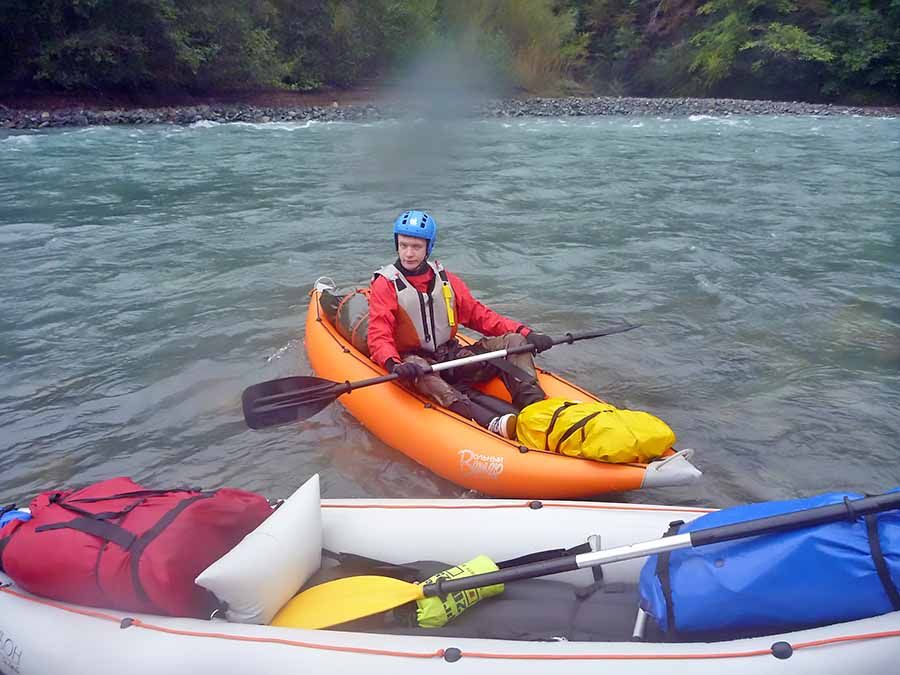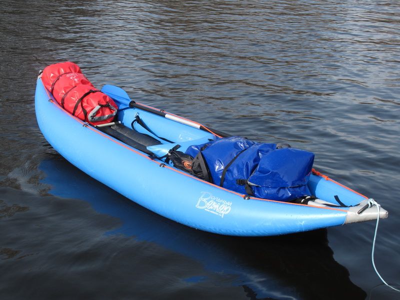 Особенность этой байдарки — закаченный нос и корма, которые позволяют легко преодолевать сливы и валы. Надувное дно обеспечивает амортизацию при столкновении с камнями и корягами, а самоотлив позволяет быстро слить воду, набранную в пороге.