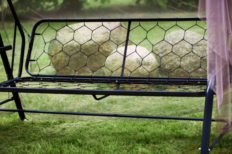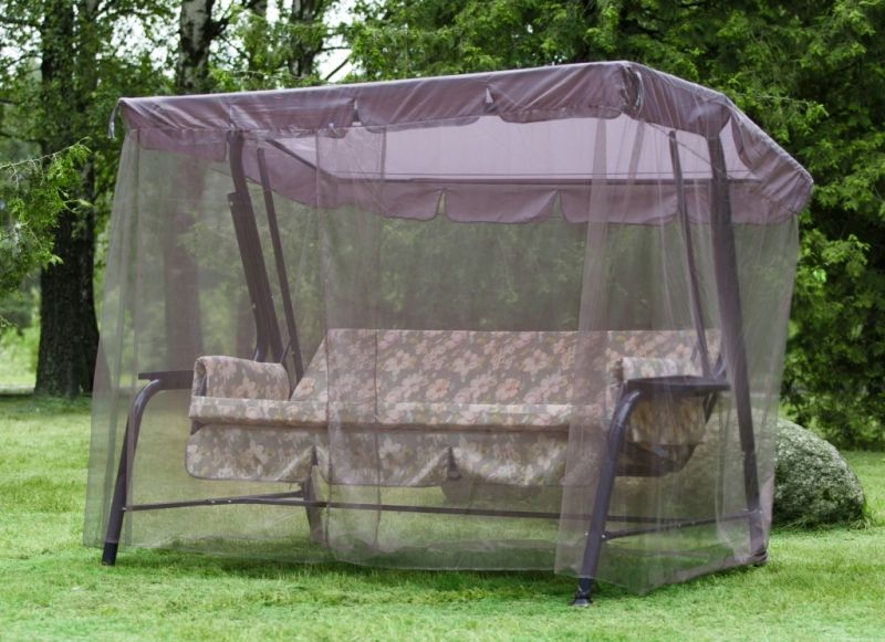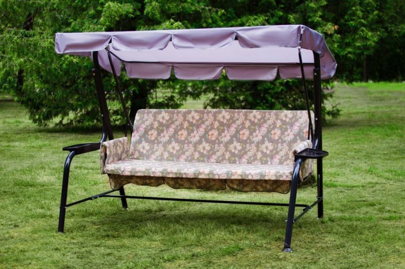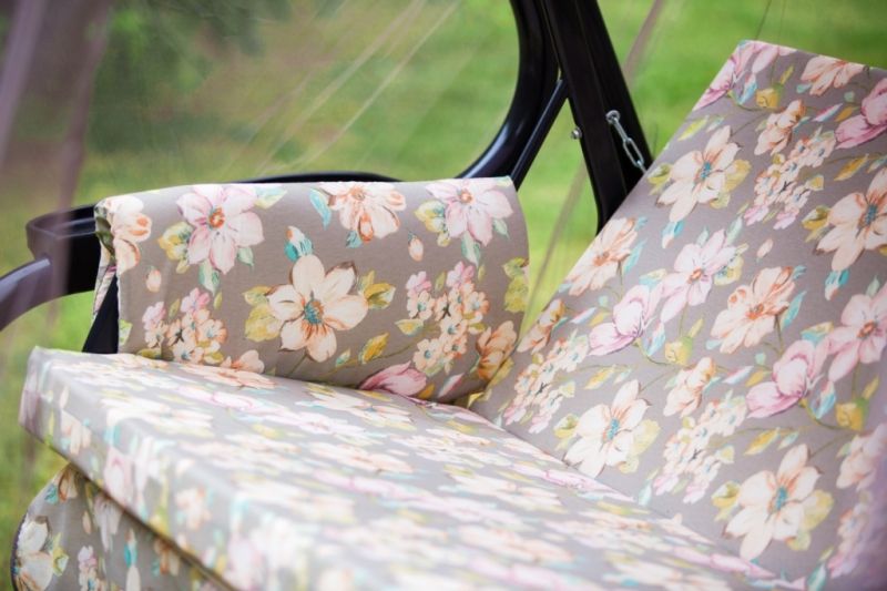 Качели состоят из разборного металлического каркаса, тканевого тента, противомоскитного тента и комплекта мягких элементов, состоящего из настила с оборкой одного мягкого элемента толщиной 80 мм и двух боковин толщиной 20 мм.