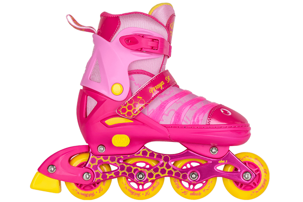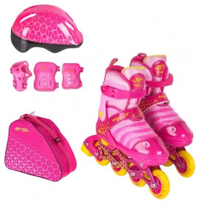 Maya Set - отличный вариант первых роликов для ребенка. Кроме роликовых коньков в набор входит шлем, защита коленей, локтей и запястий - все это выполнено в едином цветовом стиле, согласовано по размеру и сложено в сумку.