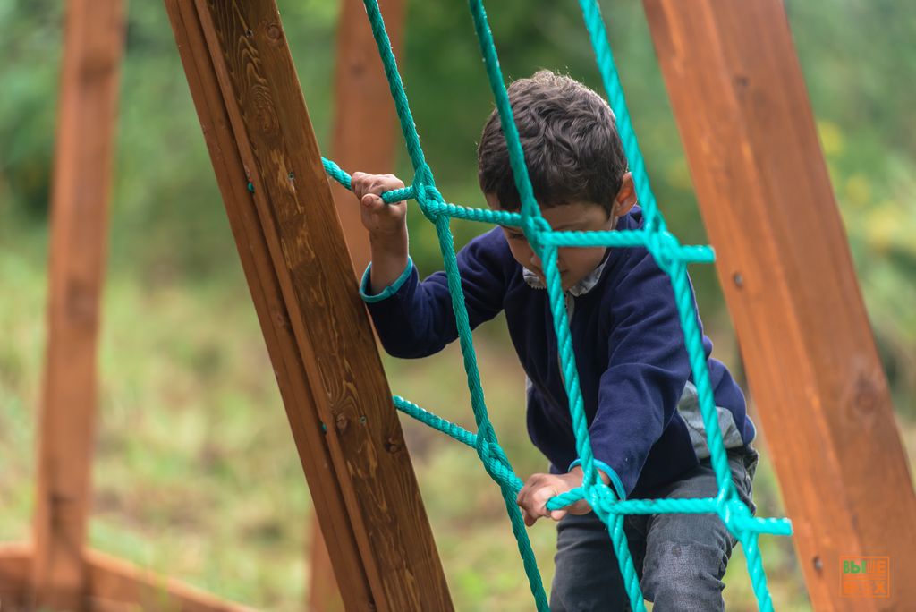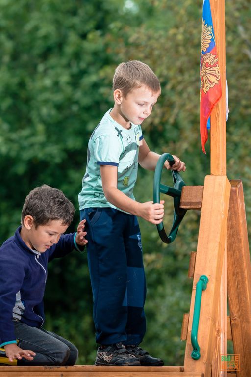 Дети просто обожают играть в скалолазов, укрепляя свои ручки и ножки. А стоять на капитанском мостике и крутить штурвал под флагом России – бесценно.
