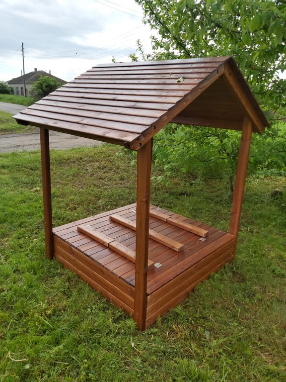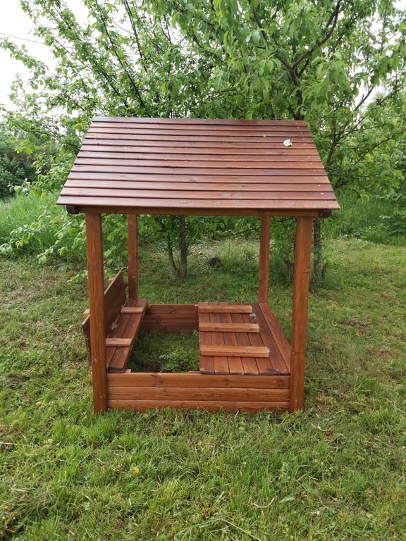 Крышка легко превращается в скамейки. Внутри можно хранить игрушки. В жаркую погоду крыша защитит ребенка от попадания солнечных лучей, а в дождь малыш благодаря ей не промокнет.