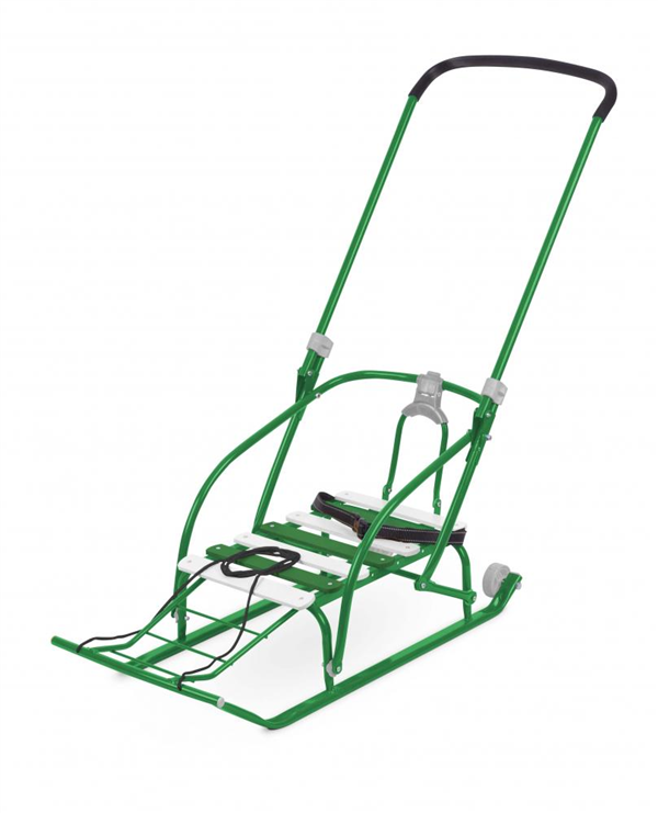 Материал: каркас – металл; сидение – рейки; ремень безопасности – ременная лента; колеса – морозостойкая пластмасса