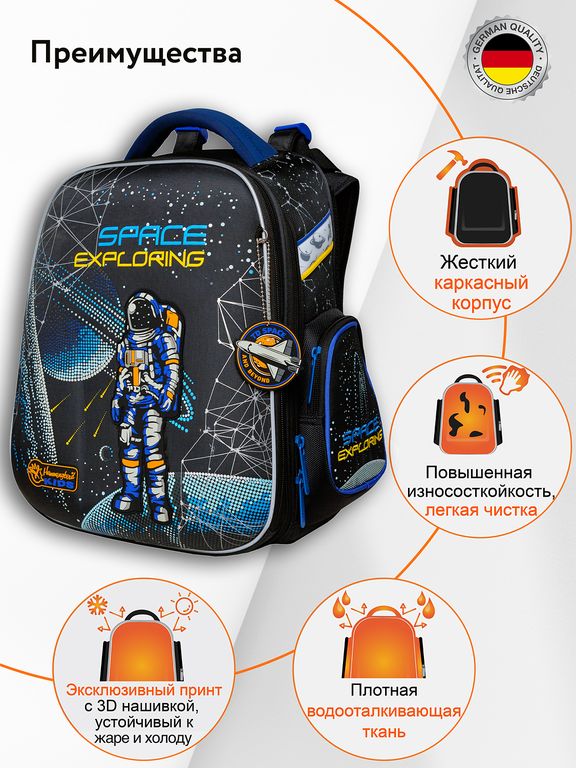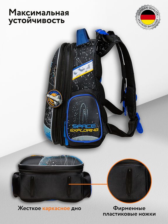 4) Усиленный, износостойкий, лёгкий каркасный корпус, прочная крышка, с жестким дном на пластиковых ножках, придающее максимальную устойчивость школьного ранца.