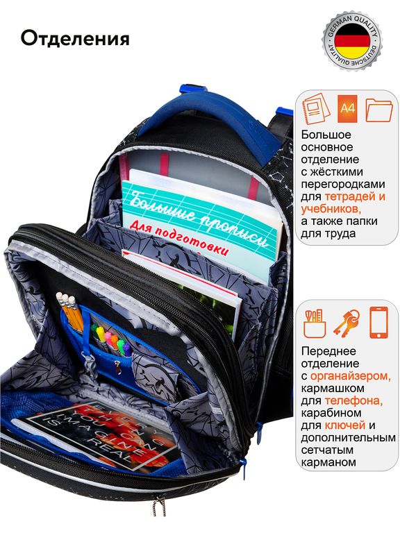 Отличительной особенностью данного ортопедического ранца для мальчиков в том, что ребёнок не подвергается риску заболевания позвоночника. Добились мы этого благодаря ряду важнейших анатомических свойств, таких как: