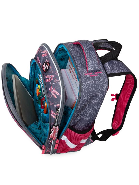 4) Усиленный, износостойкий, лёгкий корпус, прочная крышка, с жестким дном на 4 резиновых ножках, придающее максимальную устойчивость школьного ранца.