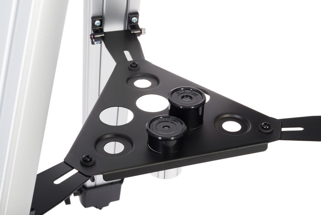 Тренога сделана из алюминия. В центре находится полочка для аксессуаров. Высоту ножек треноги можно регулировать.