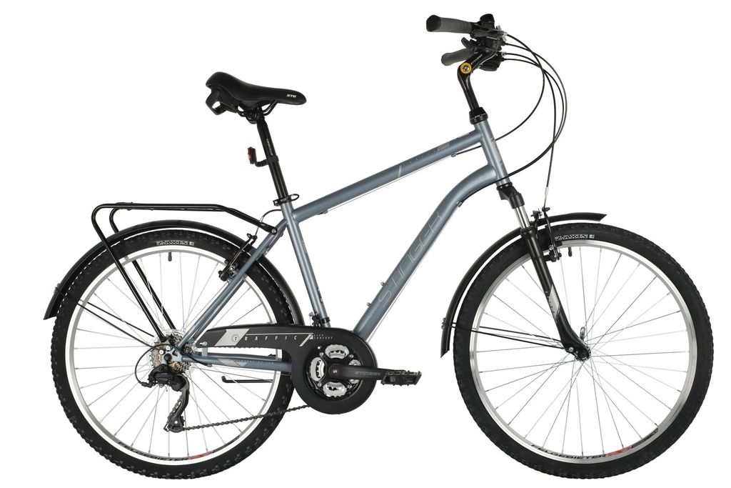 Стальной дорожный велосипед для мужчин STINGER TRAFFIC. Имеет классическую конфигурацию, подходящую для безопасного использования в городской среде. Основное отличие от остальных дорожных моделей STINGER - это стальная рама и колеса размером 26 дюймов, рама делает данную модель дешевле и доступнее без потери ее прочности, также это дает хорошую грузоподъемность. Колеса собраны с использованием двойных ободов и покрышек шириной 2 дюйма. Транcмисcия реализована на системе с размером большой звезды 42 зуба, каретке на промышленных подшипниках и 6-скоростной трещотке с использованием компонентов MICROSHIFT. Велосипед оснащен полноразмерными крыльями и багажником с несущей способностью в 25 кг, а также регулируемым выносом