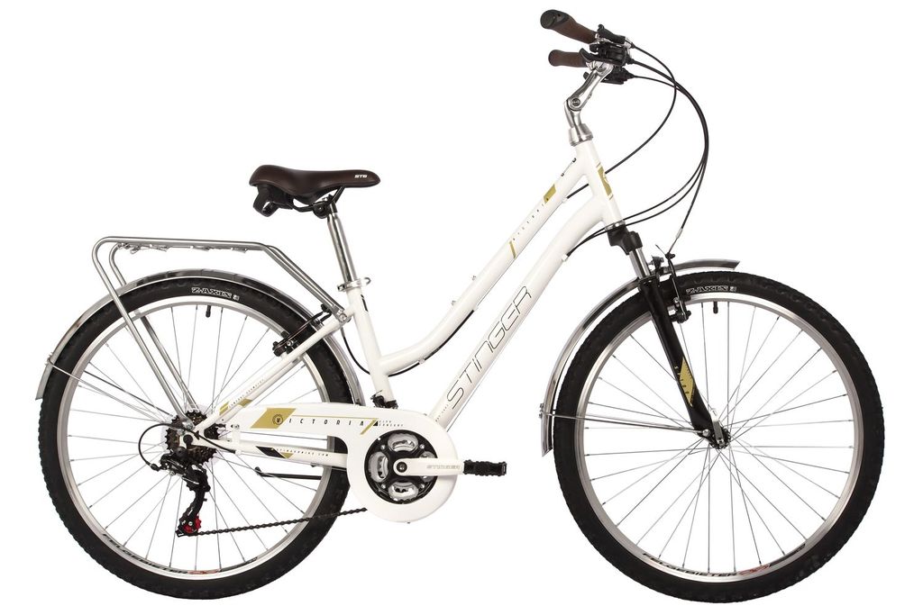 Велосипед Stinger Victoria 26" (2022) представляет собой усовершенствованный комфортный дорожный велосипед с амортизационной вилкой. Оригинальная конструкция отличается высоким качеством. Стальной женский комфортный хардтэйл. Комплектация «все включено» из коробки. Сдержанный винтажный дизайн. Рама с удлиненной рулевой трубой для комфортной посадки. Регулируемый вынос и грипсы с подпятниками для удобства хвата. Седло с вакуумной формовкой полиуретановой пены и ручкой для буксировки. Стальные полноразмерные крылья и щиток на цепь для максимальной защиты от грязи. Прочный трубчатый багажник с пружинной скобой. Амортизационная вилка, двойные обода и тормоза v-brake для уверенности на любом рельефе.